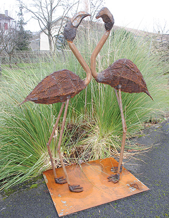Être accueilli par un tyrannosaure en acier dont la gueule béante abrite un lustre boulonné aux amygdales du bestiau, est pour le moins surprenant. Ce cerbère-réverbère d’un autre monde, escorté d’une ménagerie hétéroclite de tortue en fil de fer, de statues animalières gigantesques et ferrailleuses, de hérons en tubes galvanisés, aux longs becs emmanchés d’un écrou. Tout un univers un peu fou qui accroche l’œil et donne l’envie de s’y arrêter et de découvrir ce nouvel espace. C’est à Loiseau, à la traversée de Libourne, via le pont du Fronsac que Daniel et Alex, passionnés de brocante, d’antiquités et de créations d’artistes, ont planté cet Atelier dans un hangar au milieu d’un vaste parking. Après ces délicieuses découvertes de plein-air, on est obligé de continuer la visite et de pénétrer dans l’antre de nos deux compères, ceux qui savent si bien aiguiser notre curiosité.